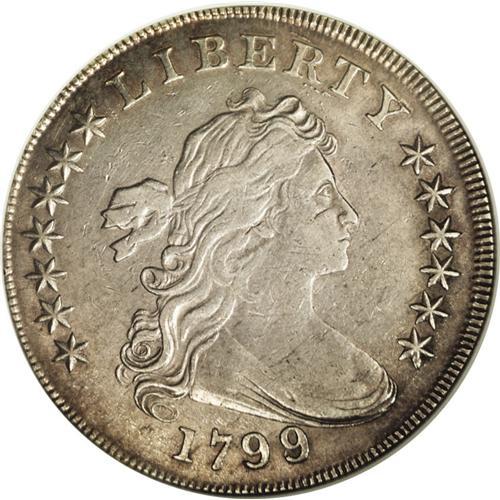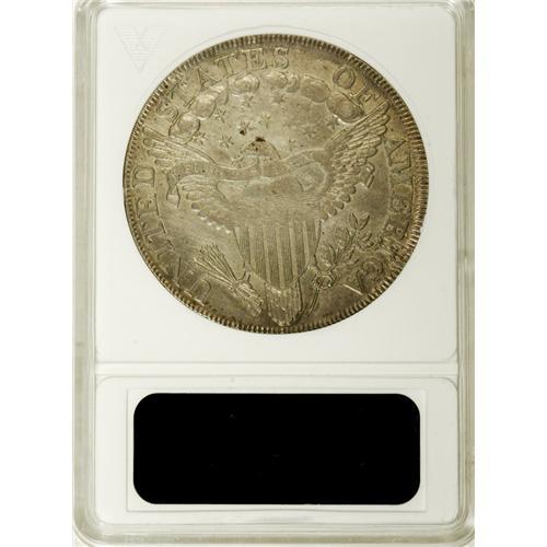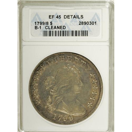 <B>1799/8 S$1 13 Stars Reverse--Cleaned--ANACS. XF45 Details.</B></I> B-1, BB-142, R.4. Identifiable as to variety by the die cracks through STATES OF and the die crumbling at the I in AMERICA. Lightly cleaned and pleasantly retoned to a medium gray hue. Strike weakness is noted in the right side of the reverse stars. Mint luster is substantial for the XF45 Details grade. An appealing circulated early dollar despite its minor hairlines.<BR><BR><b>Shipping:</b> Coin/Currency (<a target="_blank" href="http://www.heritageauctions.com/common/shipping.php">view shipping information</a>)