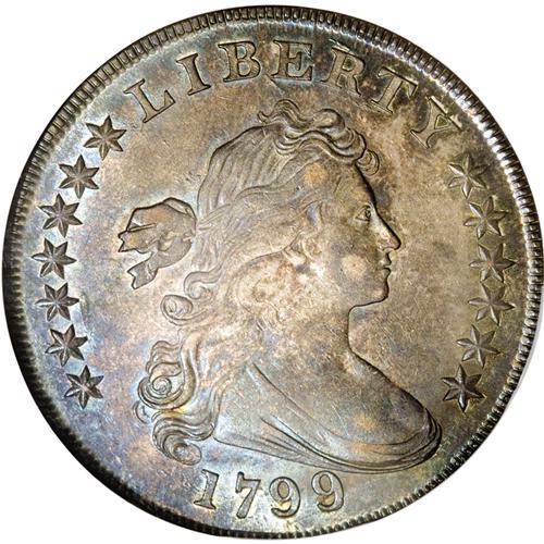 <B>1799/8 S$1 13 Stars Reverse MS62 NGC.</B></I> B-1, BB-142, R.4. This is a late die state, and may qualify as the terminal die state for the variety. It is also a remarkable Mint State piece and easily within the Condition Census for this variety. The obverse has a number of die flaws near the date and LIBERTY, and elsewhere. A feature that is readily apparent on this example is severe obverse die buckling through the stars at the right border, and the drapery. This die buckling is the cause of central design weakness. The reverse die is shattered with several cracks through STATES OF, and heavy die flaws at the first T of STATES and the I of AMERICA. Both sides of this lovely dollar are naturally toned in gray-gold, pale blue, and steel color with few blemishes of any significance. An accompanying coin box identifies this piece as the Col. Green specimen.<BR><I>Ex: Waldo C. Newcomer; Col. E.H.R. Green; James G. Macallister; T. James Clarke (New Netherlands, 48th Sale), lot 626.</B></I><BR><BR><b>Shipping:</b> Coin/Currency (<a target="_blank" href="http://www.heritageauctions.com/common/shipping.php">view shipping information</a>)