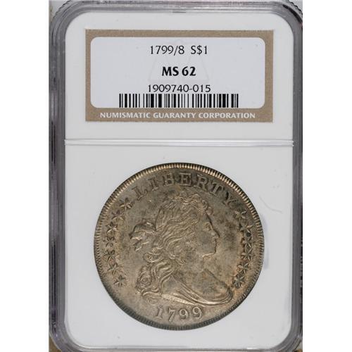 <B>1799/8 S$1 13 Stars Reverse MS62 NGC.</B></I> B-1, BB-142, R.4. Die State II. A beautiful example of the die marriage that pairs the 1799/8 Overdate die with the 13 Stars Reverse. The underdigit 8 is quite clear beneath the last 9 in the date. A tiny, near-parallel tine of metal is noted above R of LIBERTY. On the reverse two star points pierce the first cloud, while a star point touches the eagle's lower beak. Prominent die crumbling through the I of RICA promptly identifies the variety, although on this coin, in this die state, it is not as advanced as on some examples seen. Both sides are evenly covered with light silver-gray patina, beneath which considerable luster still radiates. A couple of undistracting ticks on Liberty's cheek and neck likely prevent a higher grade, but this is still a very scarce and quite attractive specimen of this popular overdate silver dollar.<BR><BR><b>Shipping:</b> Coins & Currency (<a target="_blank" href="http://www.heritageauctions.com/common/shipping.php">view shipping information</a>)