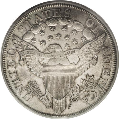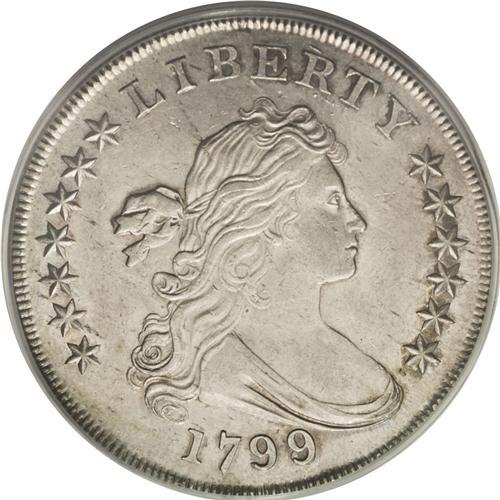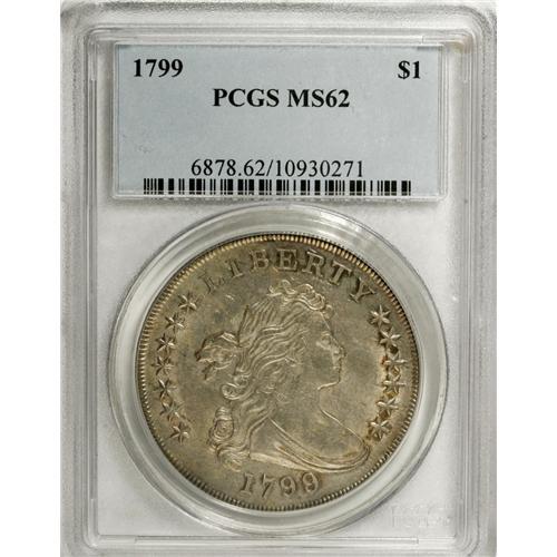 <B>1799/8 S$1 13 Stars Reverse MS62 PCGS.</B></I> B-1, BB-142, R.4. Die State II. The first 9 in the date is widely recut and strong remnants of an underlying 8 beneath the second 9 unmistakably identify this impressive Mint State dollar as an overdate. The reverse can be readily attributed by the die cracks through STATES OF and heavy die crumbling between R and I in AMERICA. Additional die flaws can be found in the vicinity of RT in LIBERTY on the obverse. We also notice traces of buckling near the base of the portrait as mentioned on the previous offering, but not enough to suggest a terminal die state. The surfaces are satiny and generally untoned, although traces of reddish-brown color cling to the devices. The overdate feature is not designated on the PCGS insert.<BR><BR><b>Shipping:</b> Coin/Currency (<a target="_blank" href="http://www.heritageauctions.com/common/shipping.php">view shipping information</a>)