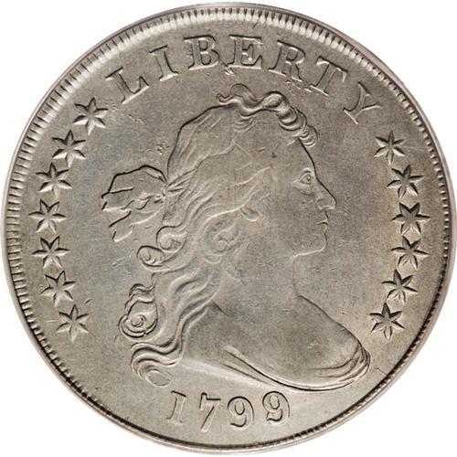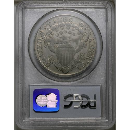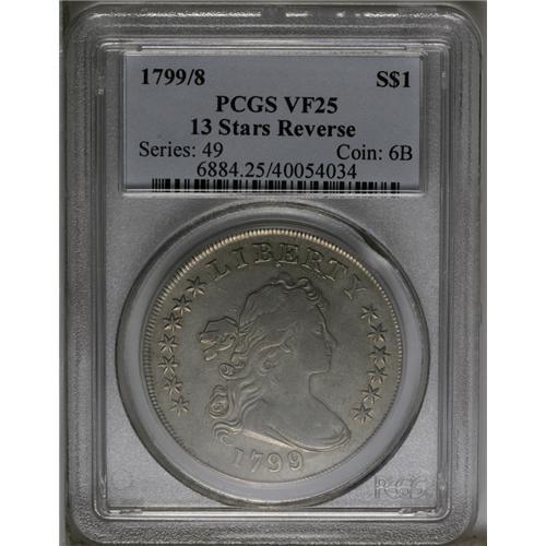 <B>1799/8 S$1 13 Stars Reverse VF25 PCGS.</B></I> B-2, BB-143, High R.4. Die State II. Overdate; 13 reverse stars, leaf point below left side of I. This variety is the scarcest of the 1799/8 overdates, with only about 100 examples known, although Dave Bowers estimated the population to be 250 to 450 coins. The overdate feature means that additional demand exists, thus the B-2 variety is very difficult to locate. This example is a later die state with reverse cracks through ATES OF AME. Medium gray surfaces with traces of champagne toning on each side. A few light abrasions are noted on each side, but the overall appearance is exceptional for the grade.<BR><I>Ex: I. Kleinman (4/2001).</B></I><BR><I>From The William Luebke Collection.</B></I><BR><BR><b>Shipping:</b> Coin/Currency (<a target="_blank" href="http://www.heritageauctions.com/common/shipping.php">view shipping information</a>)