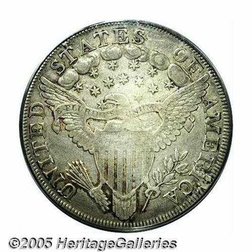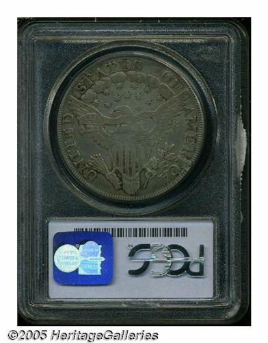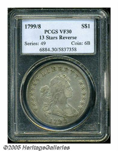 <B>1799/8<S$1> 13 Stars Reverse VF30 PCGS.</B></I> B-1, BB-142, R.4. This die pairing is most easily attributable by the cracked and scaled die between the R and I in AMERICA. This reverse was only used to produce the 1799/8 B-1, BB-142 die marriage. The surfaces are really quite attractive with light, even gray patina over each side and a slight deepening of color around the outer devices. A very pleasing, mid-grade coin.