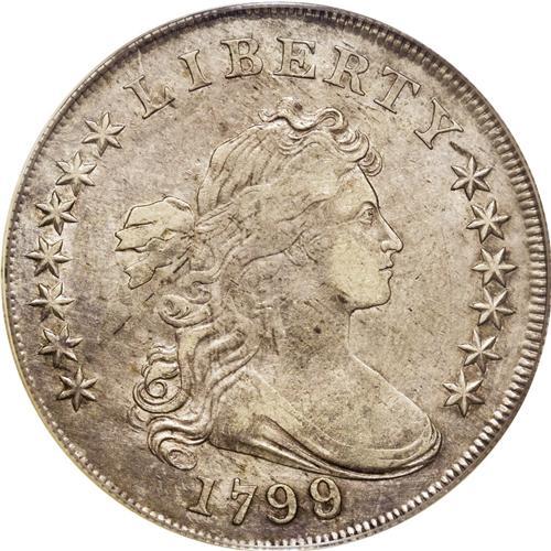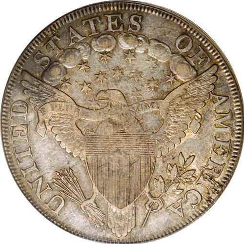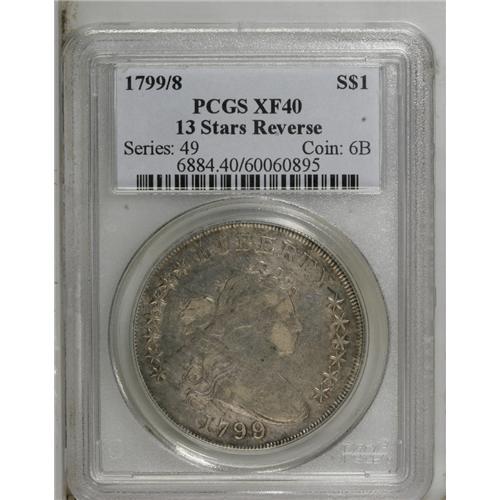 <B>1799/8 S$1 13 Stars Reverse XF40 PCGS.</B></I> B-1, BB-142, R.4. This overdate variety is promptly confirmed by the mint-made die crumbling near the I in AMERICA. Attractively toned in cream-gray, powder-blue, and salmon-pink shades. Luster brightens recessed design elements, and there are no consequential marks. The strike is slightly soft in the centers, but most of the piece is crisply impressed.<BR><BR><b>Shipping:</b> Coin/Currency (<a target="_blank" href="http://www.heritageauctions.com/common/shipping.php">view shipping information</a>)