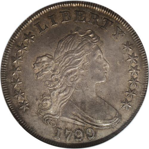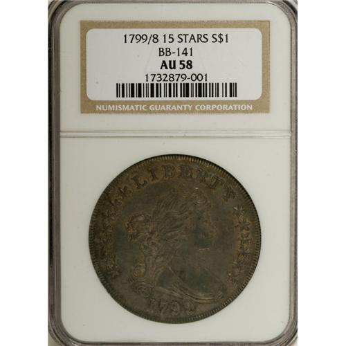 <B>1799/8 S$1 15 Stars Reverse AU58 NGC.</B></I> B-3, BB-141, R.3. Although many collectors are content with a single 1799/8 silver dollar, specialists recognize that those pieces with 13 reverse stars and others with 15 reverse stars are important variations, and opt to include both pieces in their collections. Obviously advanced die variety collectors take it one additional step and acquire the 15 Stars Overdate as well as both varieties of the 13 Stars Overdate. This example has nearly full luster visible beneath deep gray and gold toning across each side. The surface quality is excellent, although Liberty's neck has a few minor blemishes.<BR><BR><b>Shipping:</b> Coins & Currency (<a target="_blank" href="http://www.heritageauctions.com/common/shipping.php">view shipping information</a>)