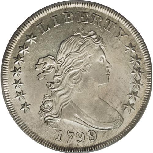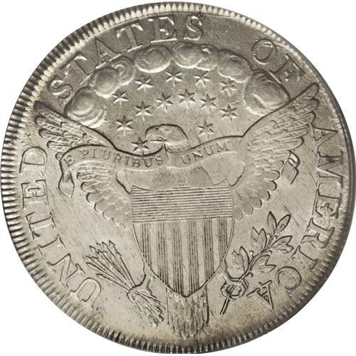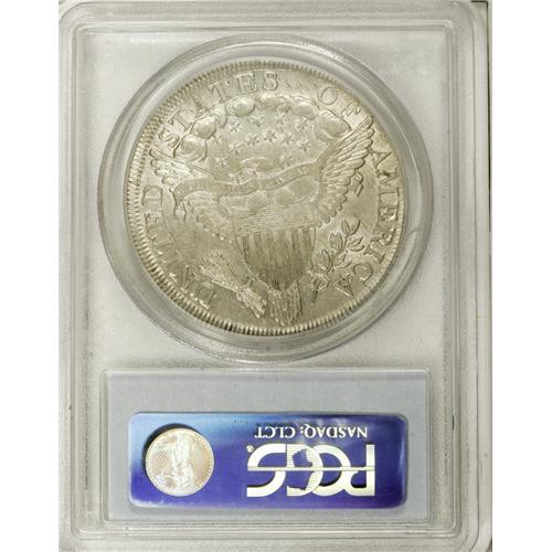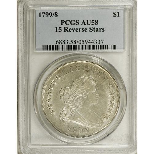 <B>1799/8 S$1 15 Stars Reverse AU58 PCGS.</B></I> B-3, BB-141, R.3. An attractive near-Mint example of this scarce overdated early silver dollar. This is the popular 15 stars reverse variety, with the extra stars partially buried beneath the clouds on the upper reverse. Toned a subdued shade of creamy silver-gray with highlights of sky-blue and speckled russet intermingled across both sides. The surfaces are still somewhat lustrous and unusually clean, with a few minor abrasions and several shallow adjustment marks across the central obverse. Population: 7 in 58, 8 finer (4/07).<BR><BR><b>Shipping:</b> Coins & Currency (<a target="_blank" href="http://www.heritageauctions.com/common/shipping.php">view shipping information</a>)