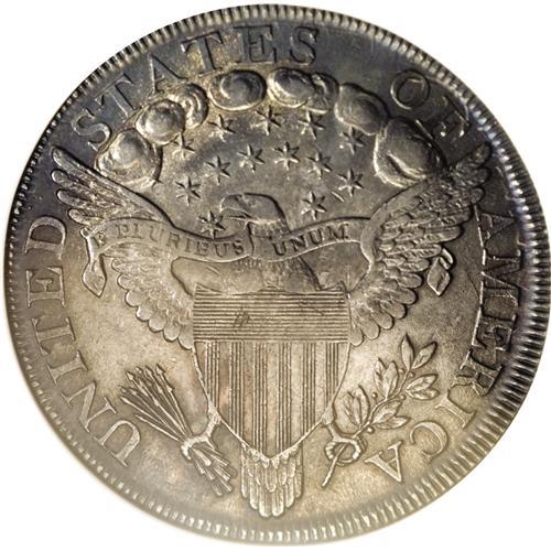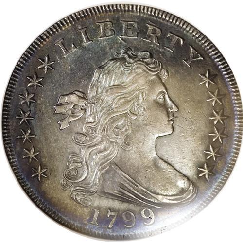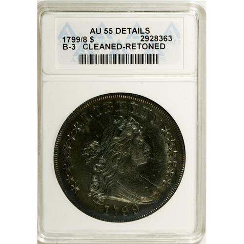 <B>1799/8 S$1 15 Stars Reverse--Cleaned, Retoned--ANACS. AU55 Details.</B></I> B-3, BB-141, R.3. Although cleaned and artificially colored, this piece still retains some of its frosty mint luster. Both sides have deep steel-gray color with additional blue-green and pale gold toning. It is far finer in appearance than the ANACS description might suggest.<BR><BR><b>Shipping:</b> Coin/Currency (<a target="_blank" href="http://www.heritageauctions.com/common/shipping.php">view shipping information</a>)