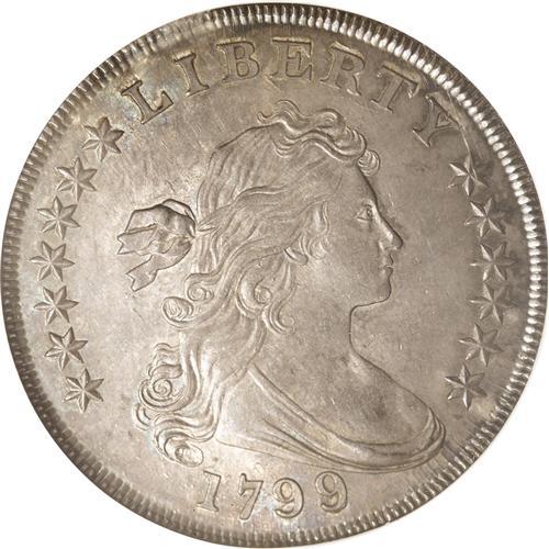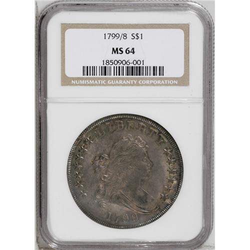 <B>1799/8<img border='0' src='http://www.heritagecoins.com/images/star.gif' width=10 height=10>$1> 15 Stars Reverse MS64 NGC.</B></I> B-3, BB-141, R.3. Die State III. The Obverse 1 of this year, the only overdate die, has a 9 punched over an 8. The last 9 in the date is extremely close to the bust. The 13 obverse stars are close, but the letters of LIBERTY are wide. On the reverse, there are <I>15 stars,</B></I> although the first and last stars in the top row are mostly concealed beneath cloud 1 and cloud 8, so that only two points of each star show.<BR> The BB-141 is the most common 1799 variety, which makes the 1799/8 overdate and blundered reverse die available to a wide range of collectors. It is even "plentiful" in Mint State, according to Bowers-Borckardt. This phenomenal near-Gem piece, however, approaches the upper end of the Condition Census as enumerated in that reference. Lush, deep toning in hues of lilac, amber, and iridescent blue fail to impede the brilliant luster that radiates from the somewhat prooflike surfaces. The strike is essentially full and impeccable, with no obvious weakness. Light clash marks are visible on each side: above stars 10-13 from the reverse dentils, and on the reverse above OF from the bust. The 9 over 8 overdate is extremely bold. There is also a strong die crack above ATES, which does not appear to be mentioned in Bowers-Borckardt. That reference lists among its "Notable Specimens" a single coin in MS64 (Rarcoa, Auction '83, 1983, lot 1162), but that coin is described as "brilliant." This toned specimen, of equal grade, appears to tied atop the Condition Census of known examples of this variety, although NGC has certified several higher-grade, unattributed 1799 varieties. A search through our own auction records reveals that this is also the <I>single highest-graded of this variety we have offered since we began keeping auction records more than a dozen years ago.</B></I>