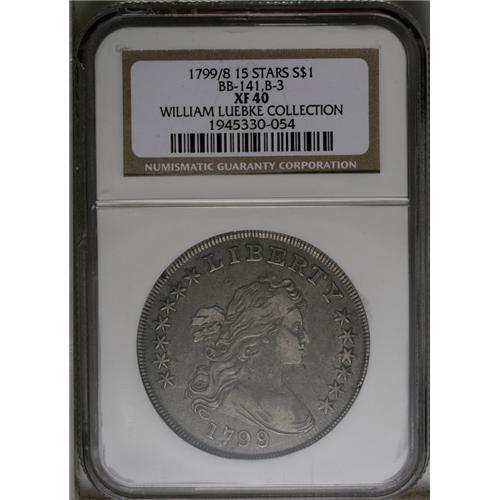 <B>1799/8 S$1 15 Stars Reverse XF40 NGC.</B></I> B-3, BB-141, R.3. Die State IV. Overdate; 15 reverse stars. This is the latest described die state of the variety. Three varieties of the 1799/8 overdate are known, all from a single obverse die that has a small die crack above the upright of R and elsewhere. Although the Bolender study suggests a different sequence, it is believed that this variety with the 15 Stars reverse was struck before the other two varieties. In fact, the overdates were actually made after certain non-overdate varieties. Dark gray-brown toning with lighter gray on the devices. Traces of deeper steel color are evident near the borders on each side. Minor abrasions are consistent with the grade.<BR> This reverse with 15 stars is quite curious. The top row has seven stars with the leftmost and rightmost stars partially covered by enlarged clouds. This is clearly an engraving error and not a leftover die from an earlier year. While some denominations exist with 15 and even 16 stars on the reverse, dating from 1796 and 1797, there are no known Heraldic Eagle dollar varieties with such a star count from those years as only the Small Eagle design was then in use.<BR><I>Ex: Wayne Herndon (2/2005).</B></I><BR><I>From The William Luebke Collection.</B></I><BR><BR><b>Shipping:</b> Coin/Currency (<a target="_blank" href="http://www.heritageauctions.com/common/shipping.php">view shipping information</a>)