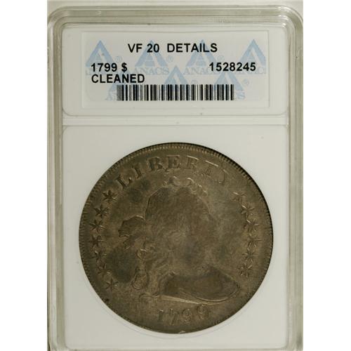 <B>1799/8 S$1 --Cleaned--ANACS. VF20 Details.</B></I> B-2, BB-143, R.4. Mislabeled as a 1799 on the holder. The cloudy golden-gray surfaces exhibit moderate wear and minor hairlines.<BR><BR><b>Shipping:</b> Coins & Currency (<a target="_blank" href="http://www.heritageauctions.com/common/shipping.php">view shipping information</a>)