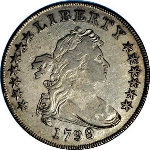 <B>1799/8<S$1> Overdate, 13 Stars. B-1, BB-142, R.2--Improperly Cleaned--NCS. VF Details.</B></I> Overdate; 13 Stars, leaf point below center of I. Reiver die state a. Bowers-Borckardt II, late. This is the Reiver plate coin both obverse and reverse for the variety. The color is a bit washed out from past cleaning, and we note faint adjustment marks through the center of the obverse and also the reverse. A few rim nicks reside on the reverse, and a small gouge is located near the end of the stem. Identifiable by a rim nick over the second S of STATES and a couple of nicks on the lower reverse edge. Starting to retone with light gold around the devices. Always in strong demand for the overdate and the coin is decent despite the problems mentioned. <BR><I>Ex: Lew Pearlman (October, 1983).</B></I> Envelope Included.