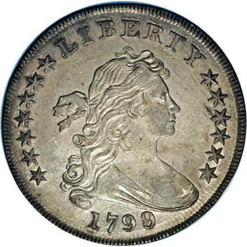 <B>1799/8<S$1> Overdate, 15 Stars.B-3, BB-141, R.2--Improperly Cleaned--NCS. XF Details.</B></I> Overdate; 15 Stars. Reiver die state a. Bowers-Borckardt die state III early. This is the Reiver plate coin for the reverse of this variety in his Early Dollar book. Well struck by the dies and without any adjustment marks or serious nicks. The surfaces show hairlines which account for the cleaning, and the coin has started retoning near the periphery. An appealing coin despite the minor problem and one which most collectors would be quite proud to own. The reverse die shows clashing at OF from Liberty's drapery, a few die dots right of D, and a die crack through MERI.<BR> This is one of the more curious engraving errors found. The engraver of the reverse put two extra stars above the eagle, rather than ignore this mistake, he decided to extend the two end clouds down over the additional stars, which would hide his mistake. This worked nicely, but a couple of points of the errant stars still peek through beneath the clouds. <BR>Purchased from Paramount, described as "AU-50. A superb example of this scarce date, with beautiful light golden toning and only a few minor handling marks on the obverse. Very sharply struck and attractive."<BR><I>Ex: Paramount (August, 1974) lot 9.</B></I> Envelope Included.