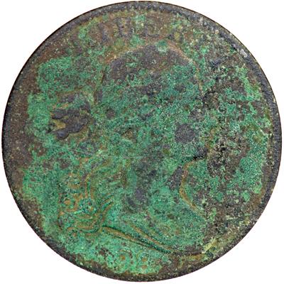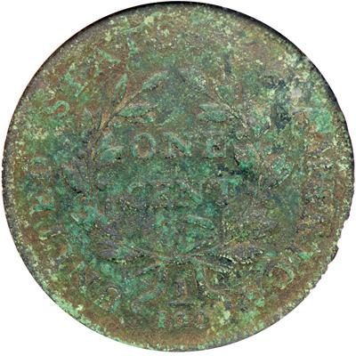 1799/8 S-188 R4. ANACS graded VF Details net G4 for corrosion. Overdate 9 over 8. Sharpness VF25 or slightly better but this cent was lost in soil for some time with the usual telltale greenish verdigris evident on both sides. Traces of dirt remain in the most-protected areas, and this cent may benefit from a careful cleaning to remove some of the crud. The date is full but not easy to make out thanks to the verdigris and crud, but a careful examination indicates there is a lot of meat hiding under the eye-catching junk that dominates the planchet. Our grade is net AG3+ as it stands; possibly better (or worse?) if given some TLC.