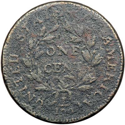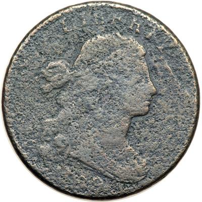 1799/8 S-188 R4 Overdate 9 over 8. About Good-3. Sharpness near F12 but covered with uniform moderate corrosion. No notable signs of contact or verdigris. The final digit of the date is clear while the other three are only partially visible, and the legends are complete, although OF is faint. Dark steel with some chocolate brown highpoints and a few small areas of reddish toning on the reverse. Unique LDS (but not the latest) with a strong die crack arcing down through TY to the rim opposite the nose tip, but the reverse is uncracked. Breen state IV early. An intermediate state not known to Sheldon or Breen. The discovery coin for the die state. Removed from an ANACS slab graded net AG3, and the Sheldon attribution is noted on the ANACS label, which is included. DWH #2214.
