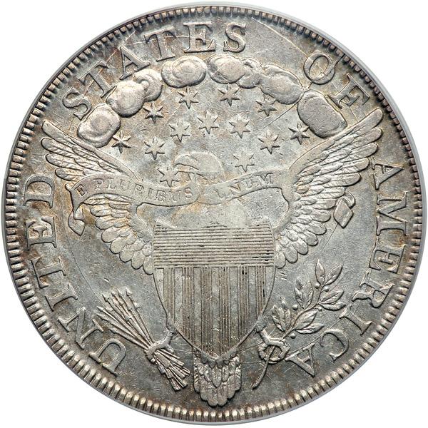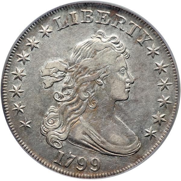 1799 B-10, BB-163 Rarity 2. PCGS graded AU-50. Nice light even grey toning on both sides. Some luster visible. The fields and devices are particularly noteworthy. Clean surfaces free from knocks and deep nicks serve to complement the fine detail present in the main devices and on the stars and legends. Light to medium silver gray patina, as described. Pop 1; 4 finer, 2 in 55, 1 in 58, 1 in 58+ (PCGS # 40054) .