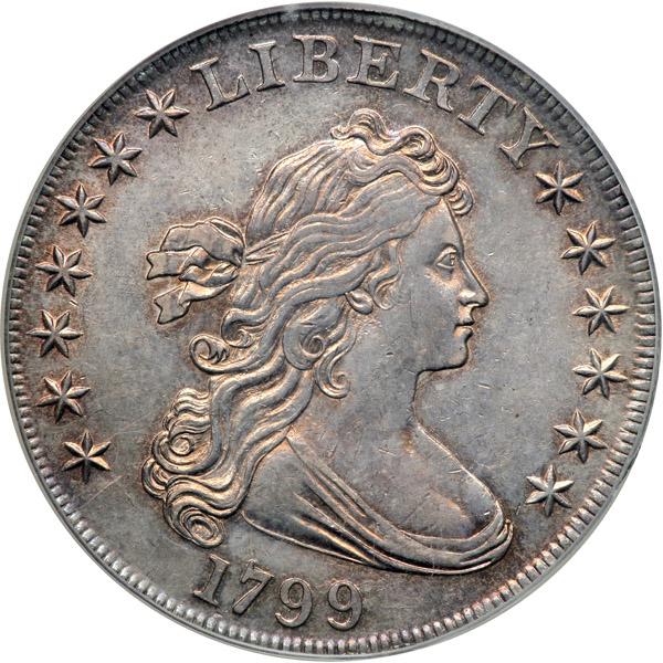 1799 B-5, BB-157 Normal Date 7X6 Stars Rarity 2. PCGS graded MS-62. CAC Approved. Soothing gold, hints of lavender, and russet hues blanket both sides of this beautiful Uncirculated coin. Loaded with flashy luster emphasized expertly by the toning. Lovely eye appeal. A balanced combination of high grade and elegant aesthetic appeal, and one that fits the Condition Census from a numerical perspective. For BB-157, the coin is quite possibly unsurpassed by any other example. Delicate golden and dusky lavender toning on the obverse, superlative surfaces. The reverse is a mixture of the same shades, and has surfaces commensurate with its origin and careful handling in the 200+ years of its existence. The striking is undeniably excellent, with superb definition and detail. All devices are bold; the rims complete, showing fine definition in the dentils. A breathtaking coin to behold, a conclusion that will surely be shared by its next owner and all others who have occasion to see it.