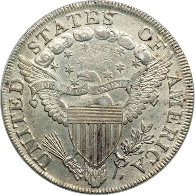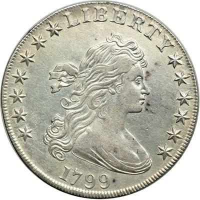 1799 B-8, BB-165 Rarity 3. NGC graded XF Details, improperly cleaned. Actually quite lustrous with some scratches (possible adjustment marks) in the area around the clouds. Our grade is Sharpness of AU-53.