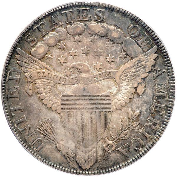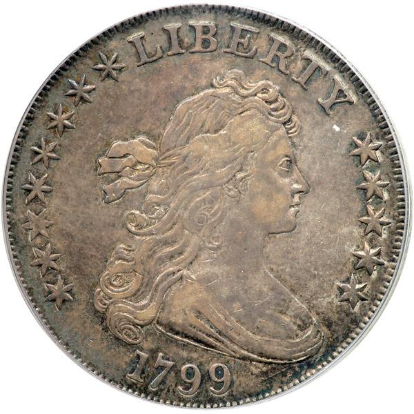 1799 Draped Bust Dollar. 8 stars left, 5 right. PCGS graded AU-53. Housed in a new secure plus holder. Pop 1; 2 finer at PCGS for the variety, 1 in 55, 1 in 58. Lovely multi-dimensional coloration graces both sides of this attractive example. The devices are marginally soft on the high points but all design features remain smooth and unimpaired by marks or mishandling -- a major benefit to someone who is looking for a properly graded PCGS example of this Red Book variety.