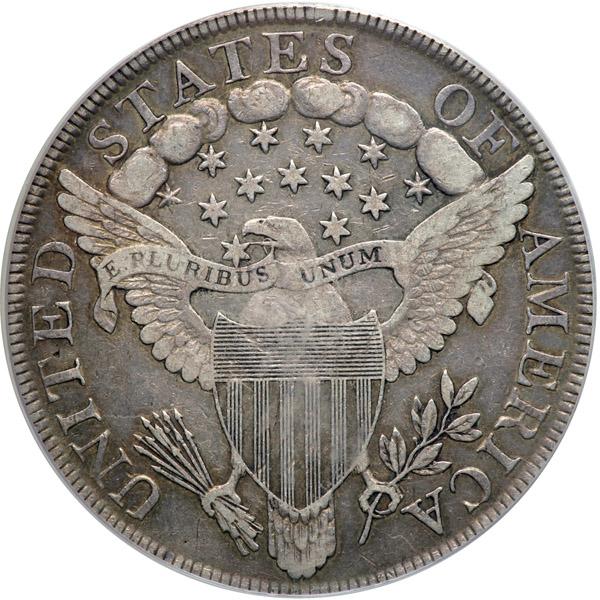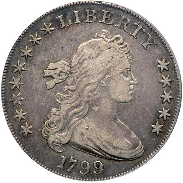 1799. 8 stars left, 5 right. B-23, BB-159. Rarity 4. PCGS graded VF-35. Even gray toning. This is a desirable Red Book variety with unusual star arrangement that collectors, when they first spot it, know there's something out of balance. But as for balanced color, strike definition, and even wear, this piece has the perfect combination of all three (PCGS # 6881) .