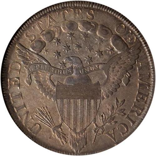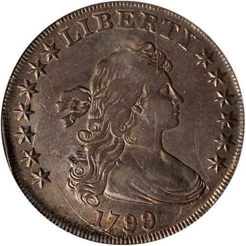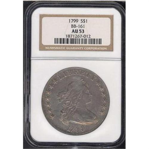 <b>1799 Draped Bust Dollar. BB-161. NGC graded AU53.</b> Light gray suggesting that it may have been dipped but then allowed to retoned to this natural shade. A well struck example that has marginal weakness in the hair curls at center and also along the tops of the ribbon bow behind the head. Similar light strike weakness is found at some of the upper right stars on the reverse. These lie opposite the point of Liberty's bust on the coin's design, and tend to be weak on more than half the surviving coins. An inexpensive year that the collector will want to choose for a Type set <b>(PCGS # 6878)</b>