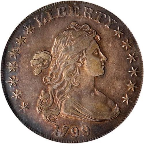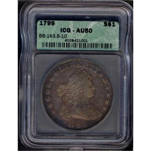 <b>1799 Draped Bust Dollar BB-163. B-10. ICG graded AU50.</b> 1799 BB-163 shares the spotlight with BB-166 as one of the two most affordable varieties of the year. Bower's offers his estimate that 1,000 to 1,800 of this variety exist. "Curiously, nearly all are in lower grade levels through VF, plus a few scattered EF and AU coins." The offering of a choice AU50 example like this, then, should attract some notice from the active buyers at the sale <b>(PCGS # 6878)</b> <i>