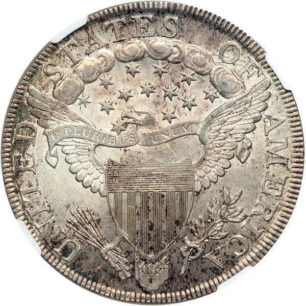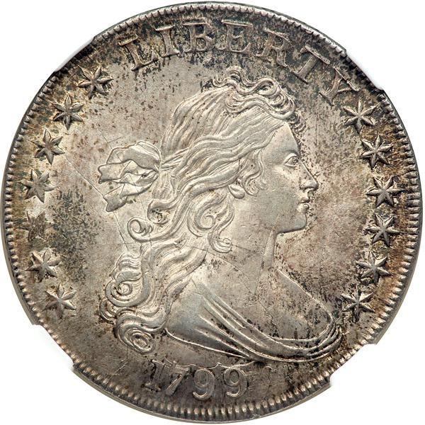 1799. B-16; BB-158. Rarity 2. NGC graded MS-64. Boldly struck with interesting die cracks; all, with lovely delicate toning. Identifiable by a toned spot on the eagle's lower beak. A remarkable early Dollar irrespective of type, date or die pairing, this 1799 Draped Bust glistens with a hard, satiny white sheen under the color as the coin is held and tilted under a light. Much of the reverse is brilliant. It is dappled olive-russet and charcoal-gray though this is generally confined to the lower periphery and within the shield. The obverse has more widely dispersed color, although here too flecks of olive-russet and charcoal-copper patina are present, also along the rim. We detect some pale champagne-pink throughout the obverse that is really not evident on the other side of the coin. Switching to the finer details, stars 3-4 on the obverse possess the only lack of sharpness, leaving the balance of the devices with a firm-to-sharp blow from the dies. The coin is fairly well centered on both sides, with only the 10-11 o'clock position on the reverse having the denticles less elongated.