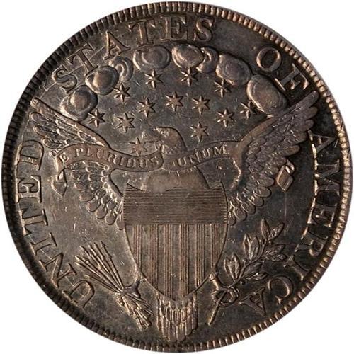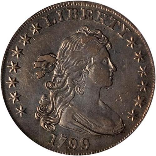 <b>1799 Draped Bust Dollar. PCGS graded AU53.</b> Possibly cleaned and then retoned, the surface is deep steel gray with shimmering highlights. Only a few widely scattered marks, and these are mainly in the fields, not affecting the facial contours or hair on Liberty. Well struck on both sides <b>(PCGS # 6878)</b>