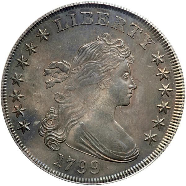 1799 Draped Bust Dollar. PCGS graded AU-55 PQ. Housed in a new secure plus holder. Pop 3; none finer at PCGS for the variety. The obverse is deeply toned with lovely deep and saturated shades of blue, gold, and russet. The reverse exhibits primarily golden hues. Centers a little weak due to uneven metal flowing into the deepest die recesses; outer margins away from the center increasingly sharp to needle-sharp with full-featured milling at the border and unimpeachable stars to either side of Liberty.