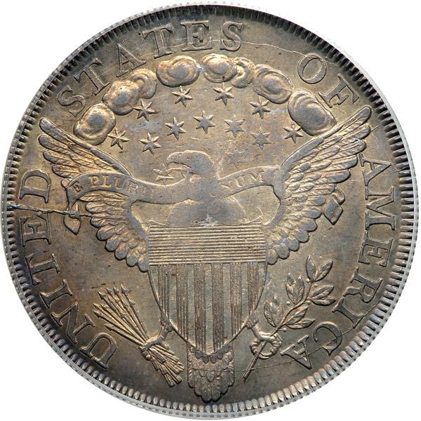 A rare die pairing, on this obverse (Bowers' Obverse 3 designation), star 8 is farther from Y than the first star from curl, or than star 7 is from L, or the last star from bust. The highest curl on top of head is centered under right the edge of E and the space between E and R, the farthest right of any 1799 obverse. This is the same die used for BB-155. The first three obverse stars show light repunching (visible on high-grade specimens). On the left, stars 2 and 3 are much closer than are any other stars to each other; stars 4-5 and 6-7 have the widest spacing. On the right, stars 8-9 and 9-10 are more closely spaced than are the other star pairs.