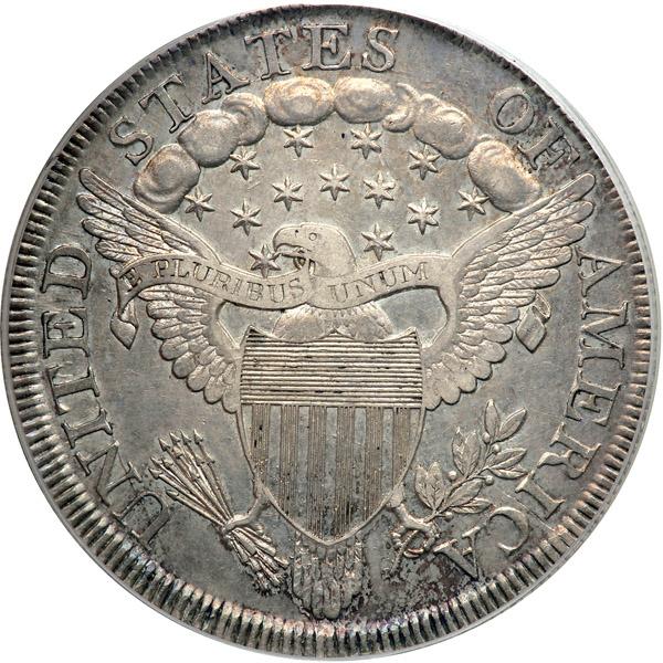 1799 Draped Bust Dollar. PCGS graded AU-50. Housed in a new secure plus holder. Pop 2; 3 finer at PCGS for the variety, 1 in 53, 1 in 58, 1 in 62. Appealing lilac tones cover both sides. A substantial amount of luster can be seen throughout. The BB-164 reverse has five extremely large berries in olive branch, the largest on any 1799 dollar. The two upper berries are partly buried in the leaves. Point of star enters eagle's mouth, upper part of beak closing down on star. The point of the star almost touches lower part of beak; ray points to left edge of left serif of U in PLURIBUS. Leaf points near left corner of I in AMERICA. A does not touch feathers. Very short stem in claw; shortest stem on any 1799 reverse.