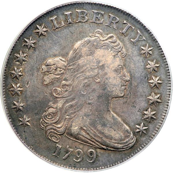 "With a known population estimated to be in the range of 300 to 500 coins, 1799 BB-168 is at once elusive but sufficiently available that every serious specialist can own one. Most specimens are in lower grades through VF. EF coins are very rare. AU coins? Where are they? Mint State? Forget it." (PCGS # 40059) .