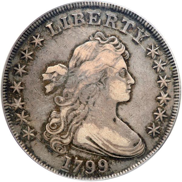 1799 Draped Bust Dollar. . BB-155, die crack at stars 1-3. PCGS graded VF-30 CAC Approved. Evenly toned with natural wear, the highest points of the design being light silvery in color, deepening to normal antique gray and dark gray elsewhere (PCGS # 6878) .