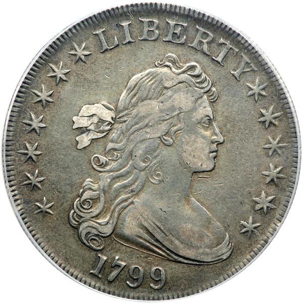 1799 Draped Bust Dollar. . BB-164, die state IV. PCGS graded VF-35. Well struck with plenty of detail for the given grade; all, overlaid with a pleasing even antique grayish-blue tone. Later die state in which a crack develops from rim up through the space between I and C on the reverse, extending into the shield above (PCGS # 6878) .