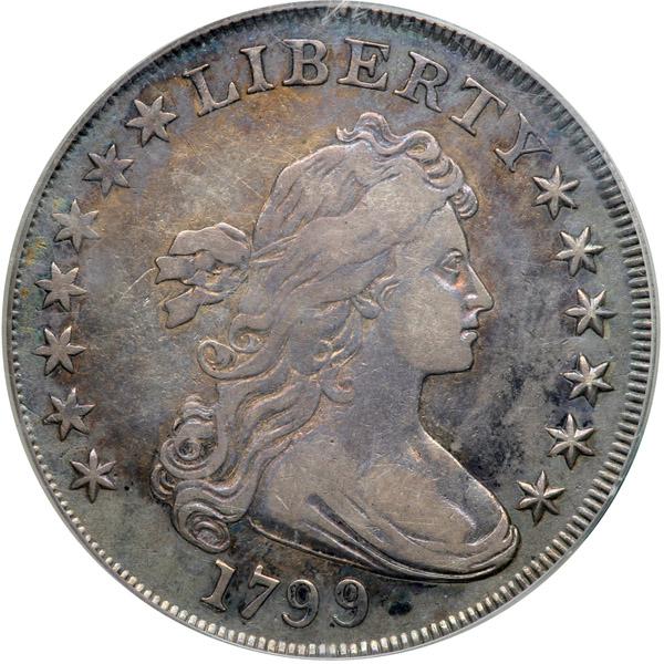 1799. PCGS graded VF-30. Very pleasing antique toning featuring hues of steel blue, grey and gold. 1799 is the year the nation's first president, George Washington (1789-1797) passed away at the age of 67 -- the close of a century, the end of an era (PCGS # 6878) .