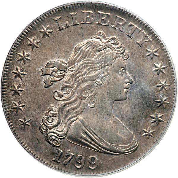 1799 B-6, BB-162 Normal Date 7X6 Stars Rarity 4. PCGS graded MS-62. Subset of PCGS # 40043. In a new secure plus holder. Condition Census. Previously graded MS63 by NGC. Offered here is an exceptional quality specimen, not only of the scarce BB-162 variety but, for wider appeal, of the Draped Bust dollar with Heraldic Eagle motif. Many varieties occur in 1798 to 1803 for collecting purposes and then, of course, the presentation pieces dated 1804, circulation strikes are not often seen as nice as here. On the obverse the hair strands are well delineated, the stars each have well defined centers, and the dentils are mostly complete around the border (although stronger in certain areas than in others). The usual points of light striking, namely the neck of the eagle, the upper part of the wing, the stars above the eagle, and certain of the clouds (particularly at the upper right) are much better defined. Add to these aspects the lovely silver-lilac and gray surfaces of the coin generating exceptional eye appeal, as well as its status among coins of the general year (without respect to the die variety) as being one of finest graded by PCGS, and you have a winner by any assessment.