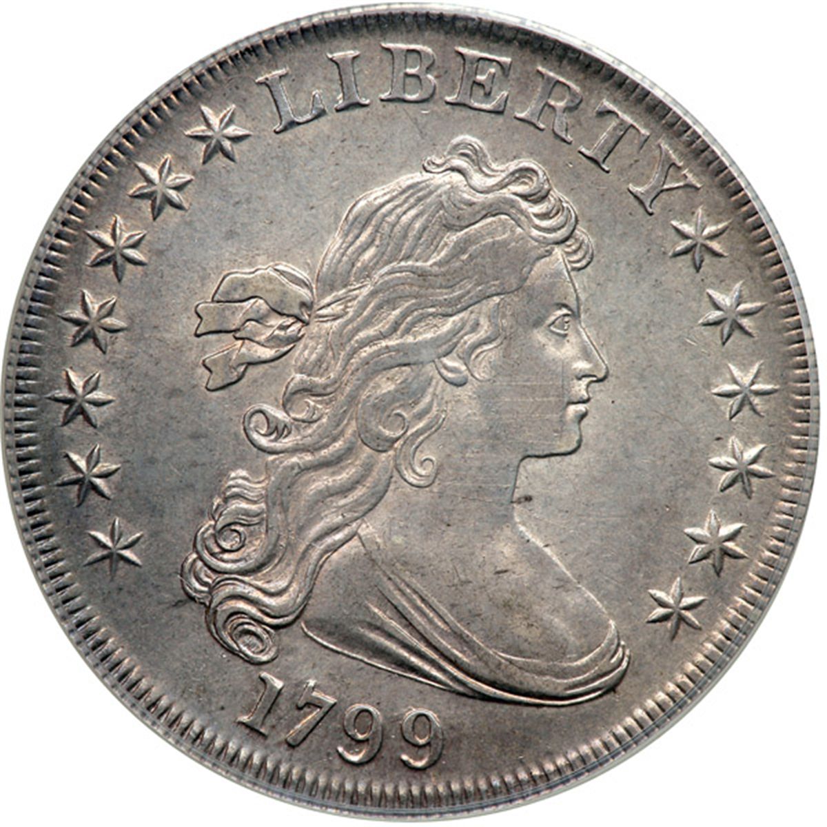 1799 Draped Bust Dollar. PCGS graded AU-58 PQ. CAC Approved. Housed in a new secure plus holder. Pop 2; none finer at PCGS for the variety. Gorgeous lilac toning and lustrous fields make this near mint state example quite desirable. A beautiful high grade example of the variety.