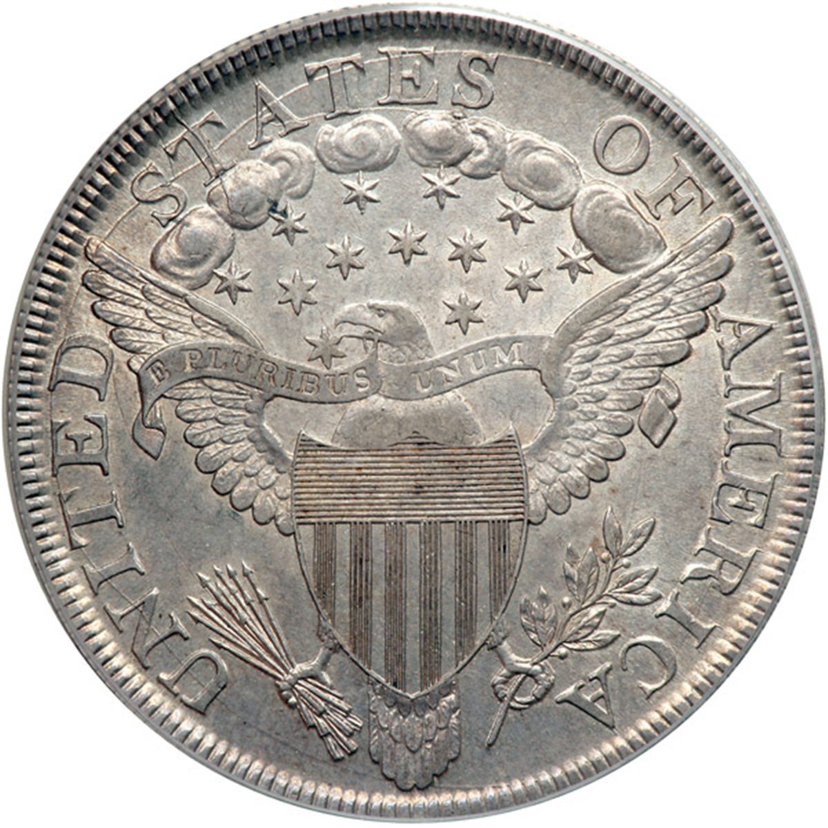 The reverse is similar to the die used to coin BB-158 (later, BB-159, BB-160, and BB-161), a die which must have been made about the same time, but can be easily distinguished. On BB-157, the two upper stars on the right have two points which touch clouds 7 and 8. On BB-158, etc., the upper right star has only one point which touches cloud 8. Reverse die used to strike 1799 BB-157 only (PCGS # 40049) .