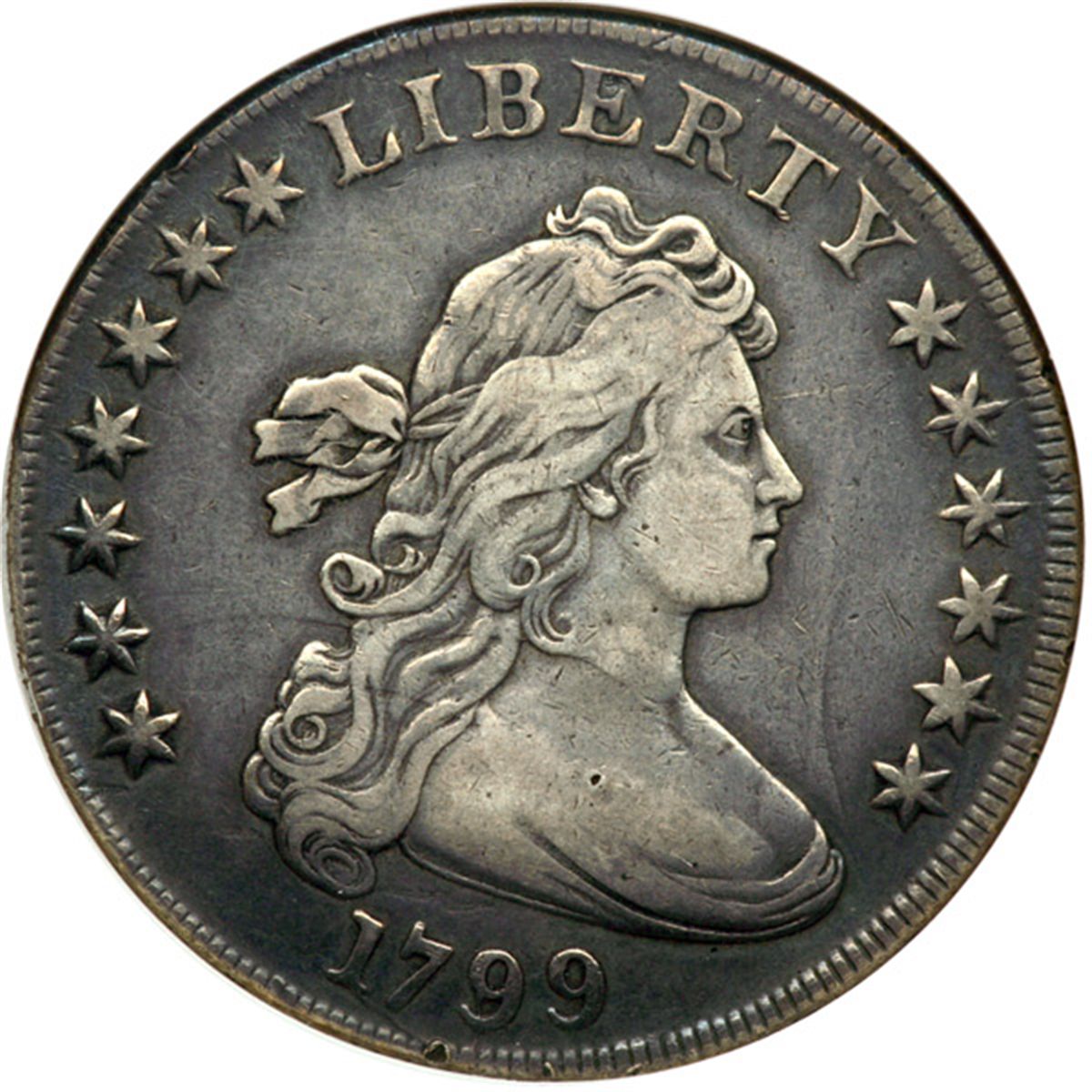 1799 Draped Bust Dollar. Nicely struck on a smooth planchet and attractively toned. The fields have the deepest silver-gray hue while lightening to the familiar (and attractive) "rubbed silver" aspect on the high points, Nature's way of giving subtle contrast some might almost say. An appealing specimen.
