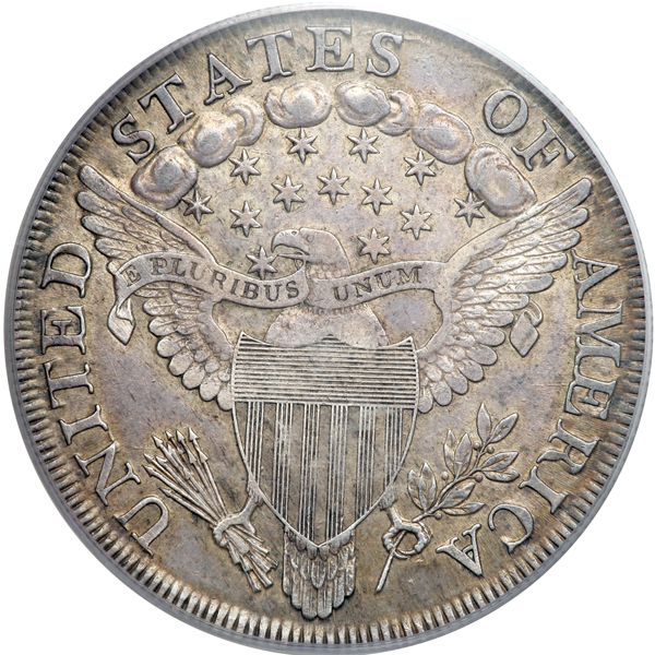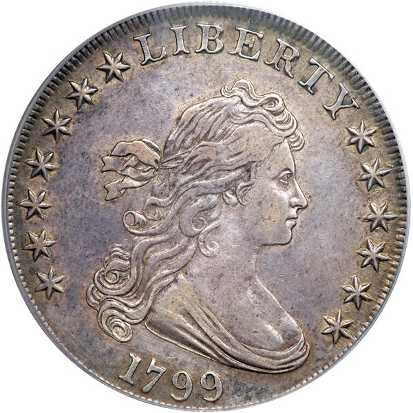 1799 Draped Bust Dollar. PCGS graded EF-45. Attractive original gray toning. Those collectors wishing to acquire a first-rate Extremely Fine bust dollar of this type, featuring the draped bust and heraldic eagle design of 1798-1803, will want to direct their attention this remarkable coin. It?s beauty is undeniable. It?s natural toning the stuff dreams are made of in a world where coin cleaning seems to all too common. Highly alluring and fully struck, with substantial detail at all stars, hair curls, drapery folds. On the reverse as well, we can report most elements are bold. Exception may be focused at the center where the eagle?s chest and head are the only areas one might fault for not being 100% sharp. But this is secondary in the overall appearance. A desirable coin. Pop 2; 3 finer at PCGS for the variety (PCGS # 40056) .