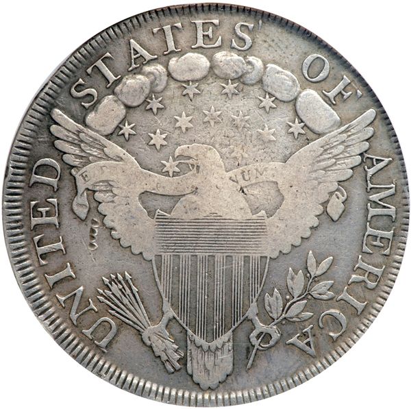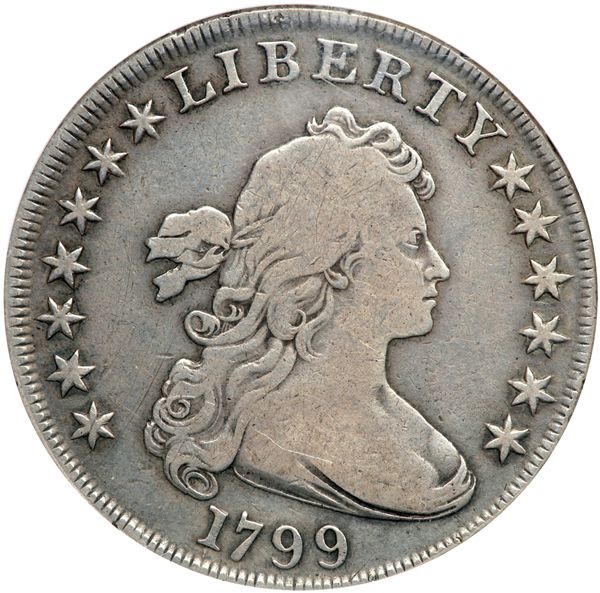 1799 B-9, BB-166 Rarity 1. NGC graded VG-8 CAC Approved. Balanced wear, balanced color, and an appreciably nicer appearance than many in this modest circulated grade. Ideal for the collector who wishes to own a representative silver dollar from the late 18th century. It so happens that 1799 is the year George Washington passed away at the age of 67 (1732 to Dec. 24, 1799).
