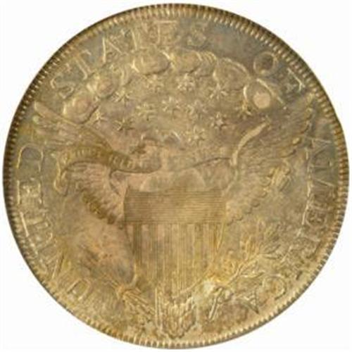 <style type="text/css"> body, td, th { font-family: Arial, Helvetica, sans-serif; font-size: 12px; color: #482424; margin: 0px; padding: 0px; } #header { background-image: url(http://www.bowersandmerena.com/ebay/images/template_v3_01.gif); clear: both; background-color: #590303; border-top-width: 2px; border-top-style: solid; border-top-color: #B38C4F;}#header #header_wrapper { height: 75px; clear: both; width: 800px; margin-right: auto; margin-left: auto; background-image: url(http://www.bowersandmerena.com/ebay/images/template_v3_03.gif); background-repeat: no-repeat; background-position: right; color: #F3EDCC;}#header #header_wrapper #header_logo { float: left; height: 75px; width: 444px; background-image: url(http://www.bowersandmerena.com/ebay/images/template_v3_02.gif); background-repeat: no-repeat; font-size: 10px; text-transform: capitalize; color: #B38C4F;}#header #header_wrapper #header_right { float: left; height: 75px; width: 356px; text-align: right;}#header #header_wrapper #header_right #headerLoginBtn { margin-bottom: 30px;}#header #header_wrapper #header_right input#txtSearch { color: #B49056; border: 1px solid #B49056; width: 175px; padding-top: 3px; padding-right: 3px; padding-bottom: 4px; padding-left: 3px;}#nav { height: 37px; background-image: url(http://www.bowersandmerena.com/ebay/images/template_v3_05.gif); clear: both;}#nav #nav_wrapper { height: 35px; width: 800px; margin-right: auto; margin-left: auto; border-left-width: 1px; border-left-style: solid; border-left-color: #B38C4F;}#nav #nav_wrapper a { padding-right: 15px; padding-left: 15px; border-right-width: 1px; border-right-style: solid; border-right-color: #B38C4F; height: 25px; padding-top: 10px; display: block; float: left; text-decoration: none; font-weight: bold; color: #5D0303;}#nav #nav_wrapper a:hover { color: #B38C4F;}#nav #nav_wrapper #search { float: right; padding-top: 7px;}#nav #nav_wrapper #search #txtSearch { font-family: Arial, Helvetica, sans-serif; font-size: 10px; text-transform: uppercase; color: #D2AE75; border: 1px solid #B38C4F; padding: 3px;}#content_bgd { background-image: url(http://www.bowersandmerena.com/ebay/images/template_v3_09.gif); background-repeat: repeat-y; background-position: center; padding-top: 15px; padding-bottom: 15px; background-color: #FBFBDB;}#content_wrapper { clear: both; height: auto; width: 800px; margin-right: auto; margin-left: auto;}.LotDetailWhite{ line-height:normal; font-size:13px; font-family: arial,helvetica,sans-serif; color: White; font-weight: bold;}.LotDetailInformation{ line-height:normal; font-size: 13px; font-family: arial,helvetica,sans-serif;}.LotDetailMessage{ line-height:normal; font-size: 13px; font-family: arial,helvetica,sans-serif; color: red;}}tr.HeaderAuctionTitle td { color: #000000; font-weight: bold; padding: 2px; background-image: url(http://www.bowersandmerena.com/ebay/images/template_v3_05.gif); background-repeat: repeat-x; border-bottom-width: 1px; border-bottom-style: solid; border-bottom-color: #B38C4F;}table.AuctionSummary a, table.AuctionSummary a:link, table.AuctionSummary a:visited { color: #0000FF; text-decoration: none;}}td.tableHeaderLeft { border-left-width: 1px; border-left-style: solid; border-left-color: #B38C4F;}td.tableHeaderRight { border-right-width: 1px; border-right-style: solid; border-right-color: #B38C4F;}td.tableCellMiddle { border-left-width: 1px; border-left-style: solid; border-left-color: #B38C4F; border-right-width: 1px; border-right-style: solid; border-right-color: #B38C4F; padding: 5px;}tr.footer td { border-top-width: 1px; border-top-style: solid; border-top-color: #B38C4F;}</style></head><body><div id="header"> <div id="header_wrapper"> <div id="header_logo"> </div> <div id="header_right"> </div> </div></div><div id="nav"> <div id="nav_wrapper"> <a href="http://www.bowersandmerena.com">Our eBayLive Auctions</a> <a href="#PaymentInfo">Payment Information</a> <a href="#ShippingInfo">Shipping Information</a> <a href="#About">About Bowers and Merena</a> </div></div><div id="content_bgd"> <div id="content_wrapper"> <table width="100%" border="0" cellpadding="5" cellspacing="0" class="AuctionSummary"> <tbody> <tr class="HeaderAuctionTitle" style="height: 25px;"> <td align="left" class="tableHeaderLeft" > </td> <td align="center" class="tableHeaderRight"> <span style="font-size: large;">Lot #708. 1799 Draped Bust Silver Dollar. BB-160, B-12. Die State I (Perfect Obverse). Rarity-3. AU-53 (NGC).</span> </td> </tr> <tr> <td colspan="3" class="tableCellMiddle"> This is a rare early die state of the relatively plentiful 1799 BB-160 die marriage, the obverse free of the often-seen cracks (as struck) to the left and right of the date. Both sides exhibit dominant gunmetal-gray patina that yields to a few small areas of near brilliance at the lower-reverse border. Direct angles call forth more vivid undertones of gold, apricot and blue colors, as well as a somewhat bright, satin-to-semi-prooflike sheen. There is little to report in the way of scattered abrasions, but we do feel compelled to mention that a letter I has been faintly scratched into the left-reverse field. Boldly defined throughout, this coin represents an important find for the early Dollar variety specialist.