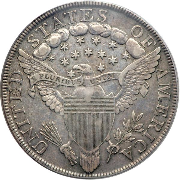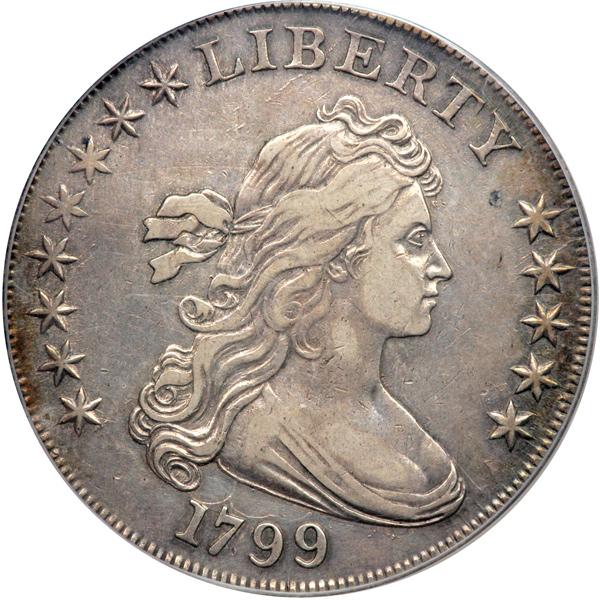 1799 Draped Bust Dollar. PCGS graded VF-30. 8x5 Obverse Stars. Housed in an Old Green Holder. Light grey and blue toning, with details aplenty and a very attractive appearance. This is because the coin received careful handling even during the years it served as money. Unlike its brethern in circulation, this handsome 1799 silver dollar wasn't knocked about. And today, some grateful collector will acquire it for his collection, to admire, to ponder, to impress his friends with (PCGS # 6878) .