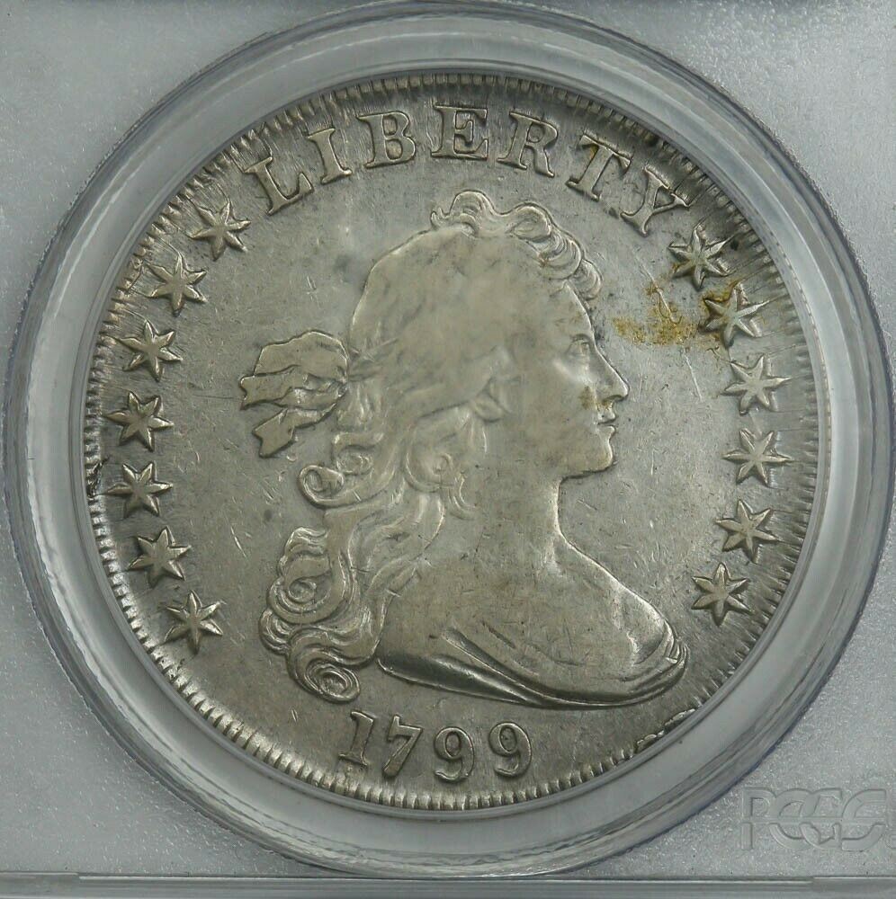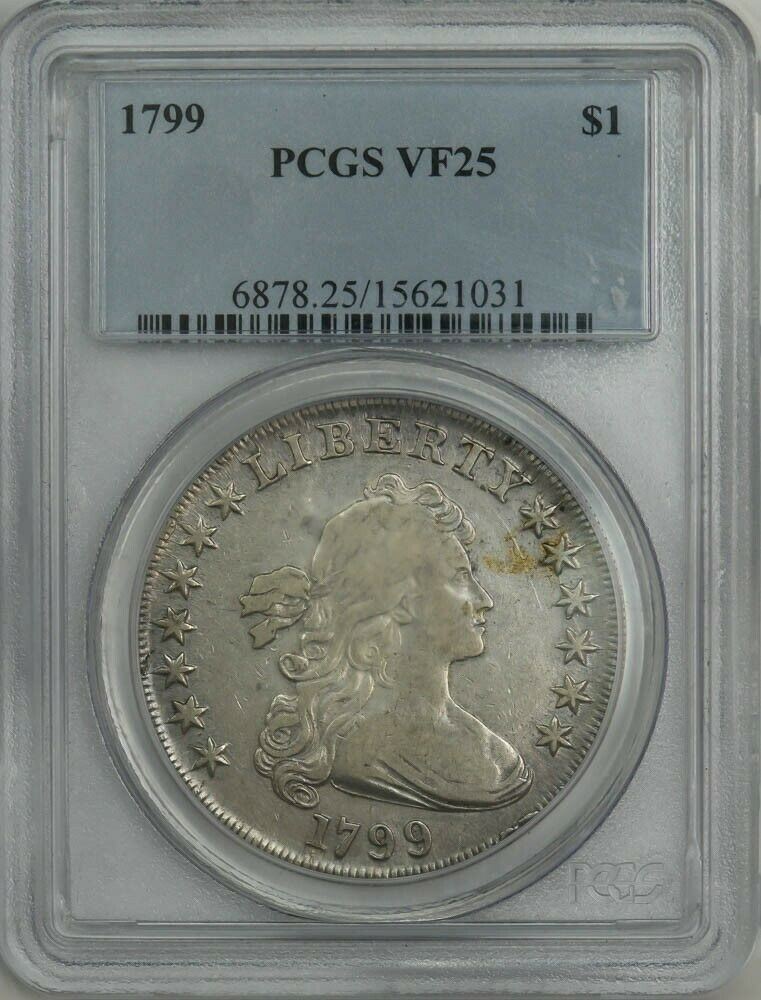 This Draped Bust Silver Dollar features 13 stars and the heraldic eagle reverse that was used from 1798 to 1804. This Silver Dollar has great detail and has been graded Very Fine-25 by NGC.