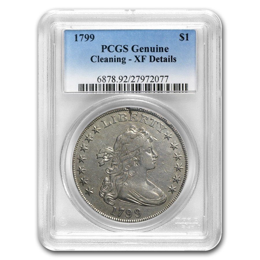 1799 Draped Bust Dollar XF-45 Details Cleaned PCGS. Valued PCGS $5400. This 215 year old Draped Bust Dollar still has plenty of detail! This Draped Bust Silver Dollar features 13 stars and the Heraldic Eagle reverse that was used from 1798 to 1804. This coin has been graded Extra Fine Details - Cleaned by PCGS.