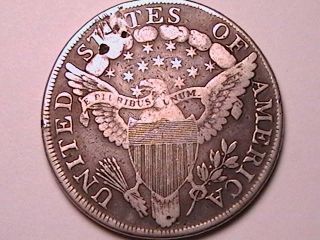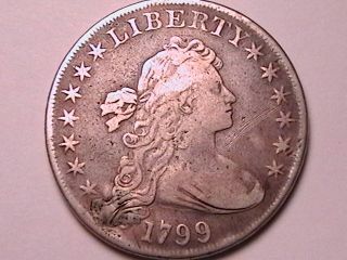 1799 Bust Dollar VF20 Repaired Attractive medium gray surfaces with a bold date and detail. Holed and repaired at the base of the hair curls. A chance to own a Draped Bust/Heraldic Eagle vintage dollar. From the year of George Washington's death.