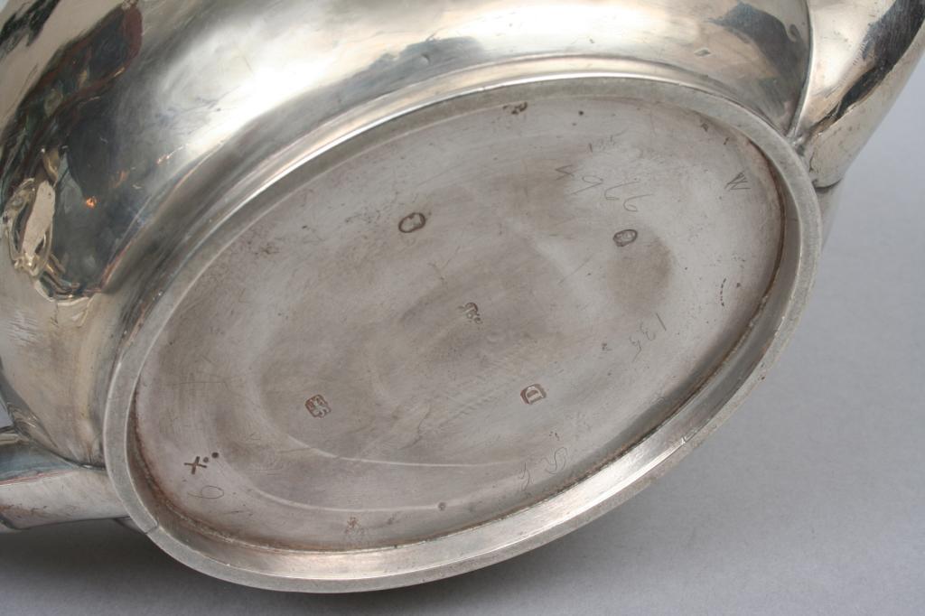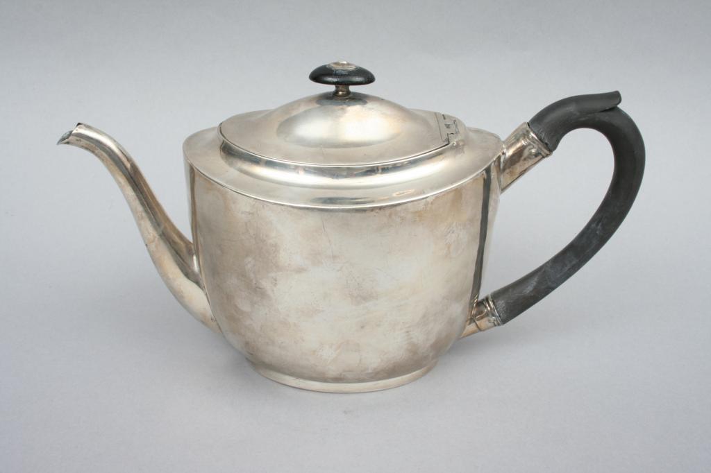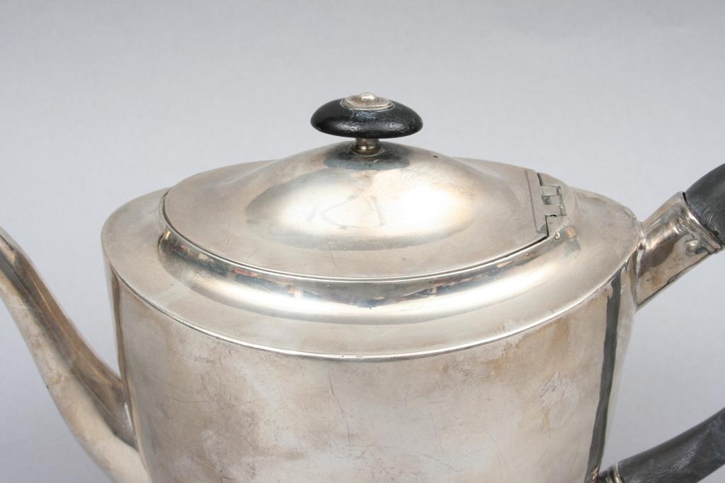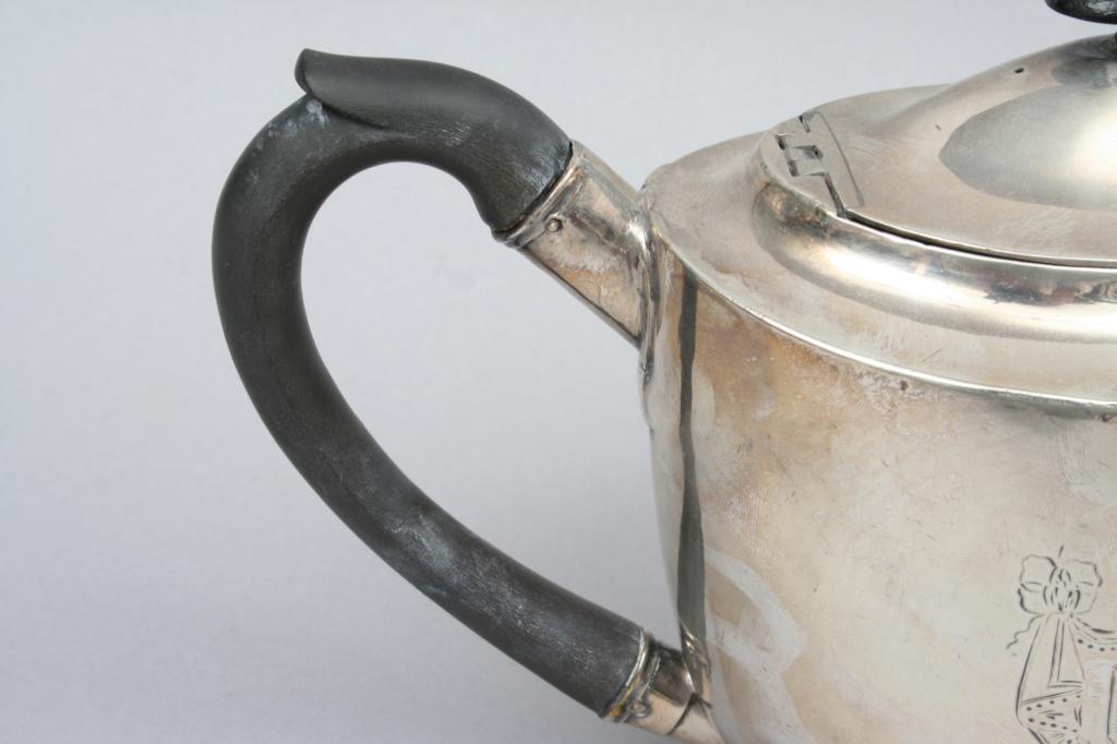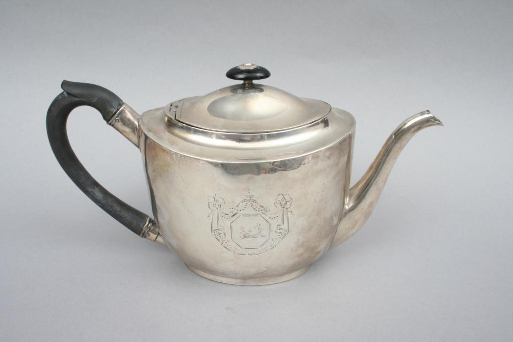 London, England, 1799, the ovoid form with hinged lid and graceful spout, surmounted by a wooden knop and handle, engraved with an armorial shield flanked by swags, hallmarked on the base and lid, indistinct makers mark. 6 1/4"H. 11"W. 5"D. 16.80 ozt. Condition: some light dents and light surface imperfections.