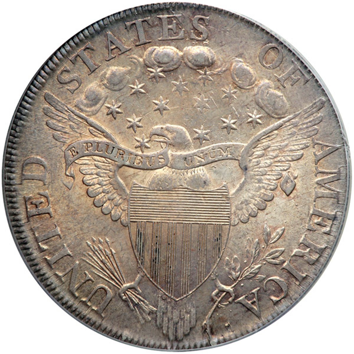 The Reverse is from 1798. Struck from the same die as BB-123 and BB-124 of the 1798 dollars, the 5 berries are the smallest of any variety of the 1799 date (just like BB-164 has the largest berries of any variety of the 1799 date). A die crack joins the stem end to the border below. As mentioned above, this is a significant variety as the only 1799 dollar with a "line pattern " of stars on the reverse. Most seen are very weakly struck on the reverse stars (but not as weak as on 1798 BB-124, on which the weakness was caused by an extensively damaged lower right obverse die being opposite on the coin). Far right edge of A is over cloud 3. Reverse die used to strike 1798 BB-123 (earliest state), BB-124 (intermediate state, now relapped); and 1799 BB 152 (latest state) (PCGS # 40045) .