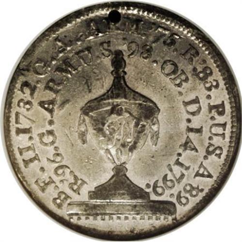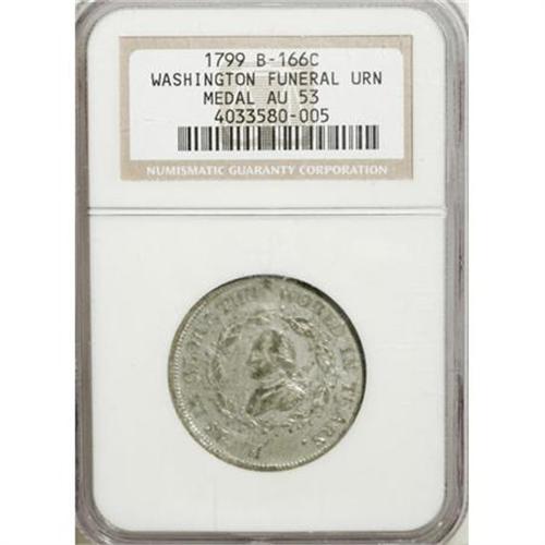 <B>1799 MEDAL Funeral Urn AU53 NGC.</B></I> <B>1799 Washington Funeral Urn Medal AU53 NGC.</B></I> Baker-166C. Variety 4-C2. White Metal. Holed for suspension, as always, these pieces were worn around the neck at Washington's funeral procession. Rulau estimates that somewhere between 35 and 70 pieces are extant today in white metal. This is a pleasing and slightly wavy piece that shows light friction over the highpoints, and these same highpoints display a pronounced darkening of the metal to a deep gray. Otherwise, the fields and recessed areas of the medal are bright and silvery appearing. A few moderate marks are detected beneath a loupe. An important and historic piece of Washingtonia.<BR><BR><b>Shipping:</b> Coins & Currency (<a target="_blank" href="http://www.heritageauctions.com/common/shipping.php">view shipping information</a>)