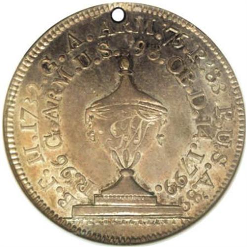 <B>1799 MEDAL Funeral Urn MS61 NGC.</B></I> <B>1799 Washington Funeral Urn Medal MS61 NGC.</B></I> Silver. Baker-166A, R.6. Die Variant 1-B. 8.76 grams. George Washington died on December 14, 1799. These medals were coined early in 1800 to be worn at his Civic Funeral Procession held on February 22 in Boston. The obverse carries a uniformed bust of Washington encircled by the fitting inscription HE IS IN HIS GLORY, THE WORLD IN TEARS. The reverse displays a funeral urn with the inscribed initials GW. Both sides of this piece exhibit steel-gray toning that lightens substantially around the devices. Since people actually did wear these medals to pay homage to the late President, all known pieces display the characteristic hole through the top. The plug was neatly executed. A fleeting opportunity for the Washington enthusiast. Russell Rulau and George Fuld in their book <I>Medallic Portraits of Washington</B></I> speculate that only 25 to 40 examples of this variety are known in silver.<BR><BR><b>Shipping:</b> Coins & Currency (<a target="_blank" href="http://www.heritageauctions.com/common/shipping.php">view shipping information</a>)