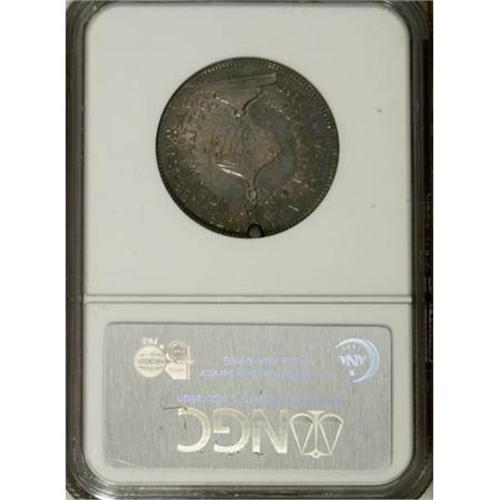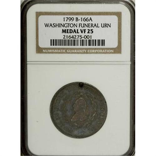 <B>1799 Washington Funeral Urn Medal, Silver VF25 NGC.</B></I> Baker-166A, R.6. Dies 1-B. Two large funeral processions were staged in early 1800 for Washington, who had died on December 14, 1799. Baker-165, distinguished by a skull and crossbones on the lower reverse, was worn by certain attendees of the Masonic ceremony on February 11. The civic procession took place on February 22, and the Baker-166 medal was worn by some of those present. A small hole at 12 o'clock is characteristic of the issue. Deeply toned in electric-blue and peach colors, which serve to subdue several moderate pinscratches.<BR><BR><b>Shipping:</b> Coins & Currency (<a target="_blank" href="http://www.heritageauctions.com/common/shipping.php">view shipping information</a>)