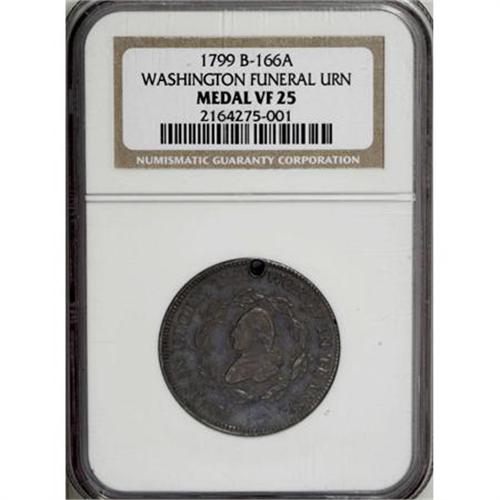 <B>1799 Washington Funeral Urn Medal, Silver VF25 NGC.</B></I> Baker-166A, R.6. Dies 1-B. Two large funeral processions were staged in early 1800 for Washington, who had died on December 14, 1799. Baker-165, distinguished by a skull and crossbones on the lower reverse, was worn by certain attendees of the Masonic ceremony on February 11. The civic procession took place on February 22, and the Baker-166 medal was worn by some of those present. A small hole at 12 o'clock is characteristic of the issue. Deeply toned in electric-blue and peach colors, which serve to subdue several moderate pinscratches.<BR><BR><b>Shipping:</b> Coins & Currency (<a target="_blank" href="http://www.heritageauctions.com/common/shipping.php">view shipping information</a>)